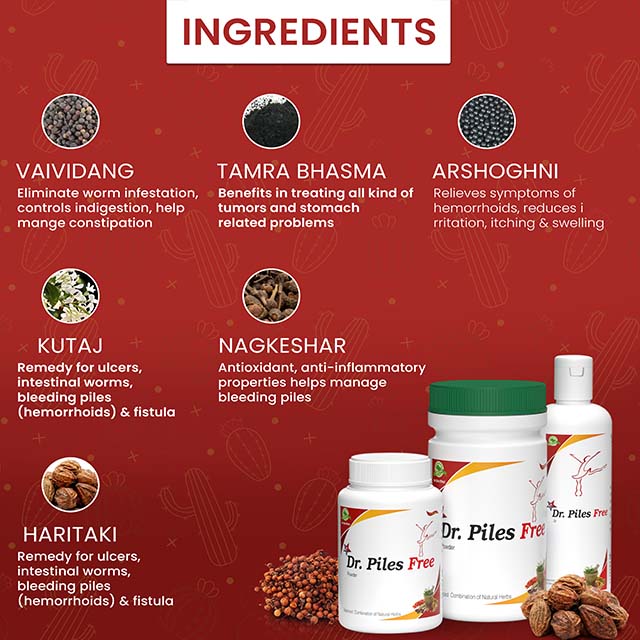 Dr Piles Free is an ayurvedic medicine for piles and Fissure that helps relieve constipation, pain, burning sensations, and itching. Complications like strangulation, anemia, blood clots & infections caused due to piles can be relieved by this medicine.