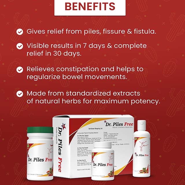 Dr Piles Free Capsule gives quick relief from pain and controls bleeding associated with piles. Powder gives relief from complications like strangulation, anemia, blood clot, itching, and burning. And Dr. Piles Free Oil soothes boils, softens them, and reduces swelling.